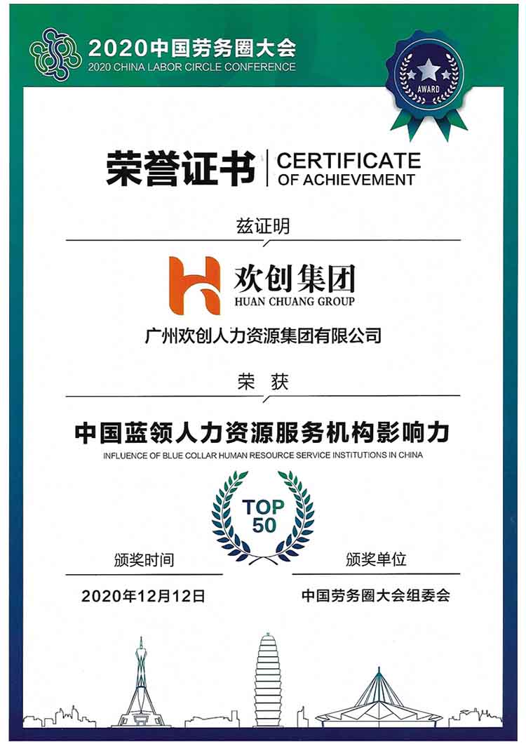 半岛(中国)一站式服务平台集团荣获中国蓝领人力资源服务机构影响力TOP50证书
